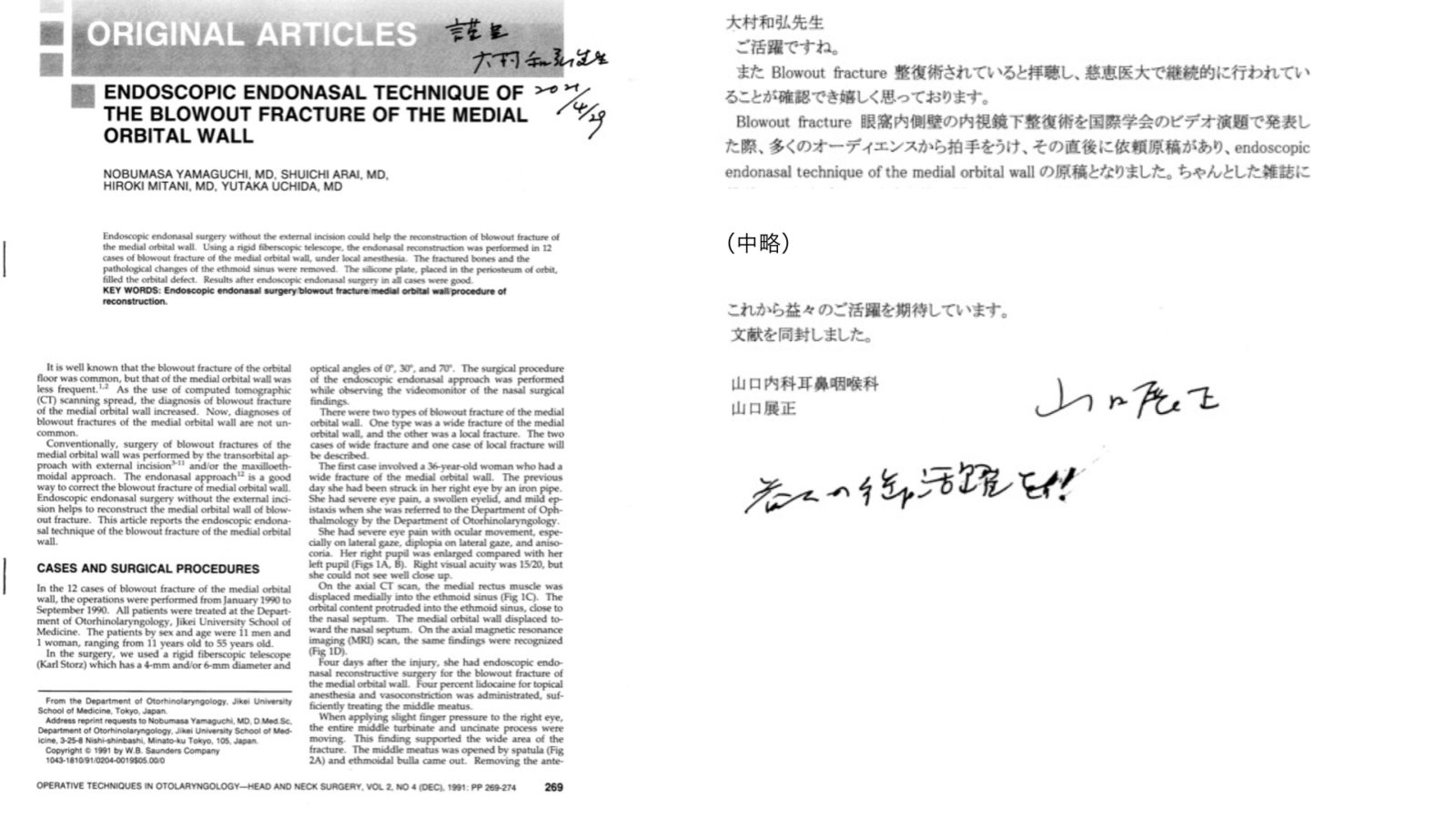 その発表を受けて、先日、慈恵医大のOBの山口展正先生(現在東京都杉並区にある山口内科耳鼻咽喉科院長https://yama-naika-ent.jp/)より、ご自身が1991年に内視鏡で眼窩内側壁骨折を整復する(今でも耳鼻科で手術ができる病院が少ない)手術を世界に先駆けて慈恵医大から発信されていたということをお手紙と共に論文を送っていただき、教えていただきました。
